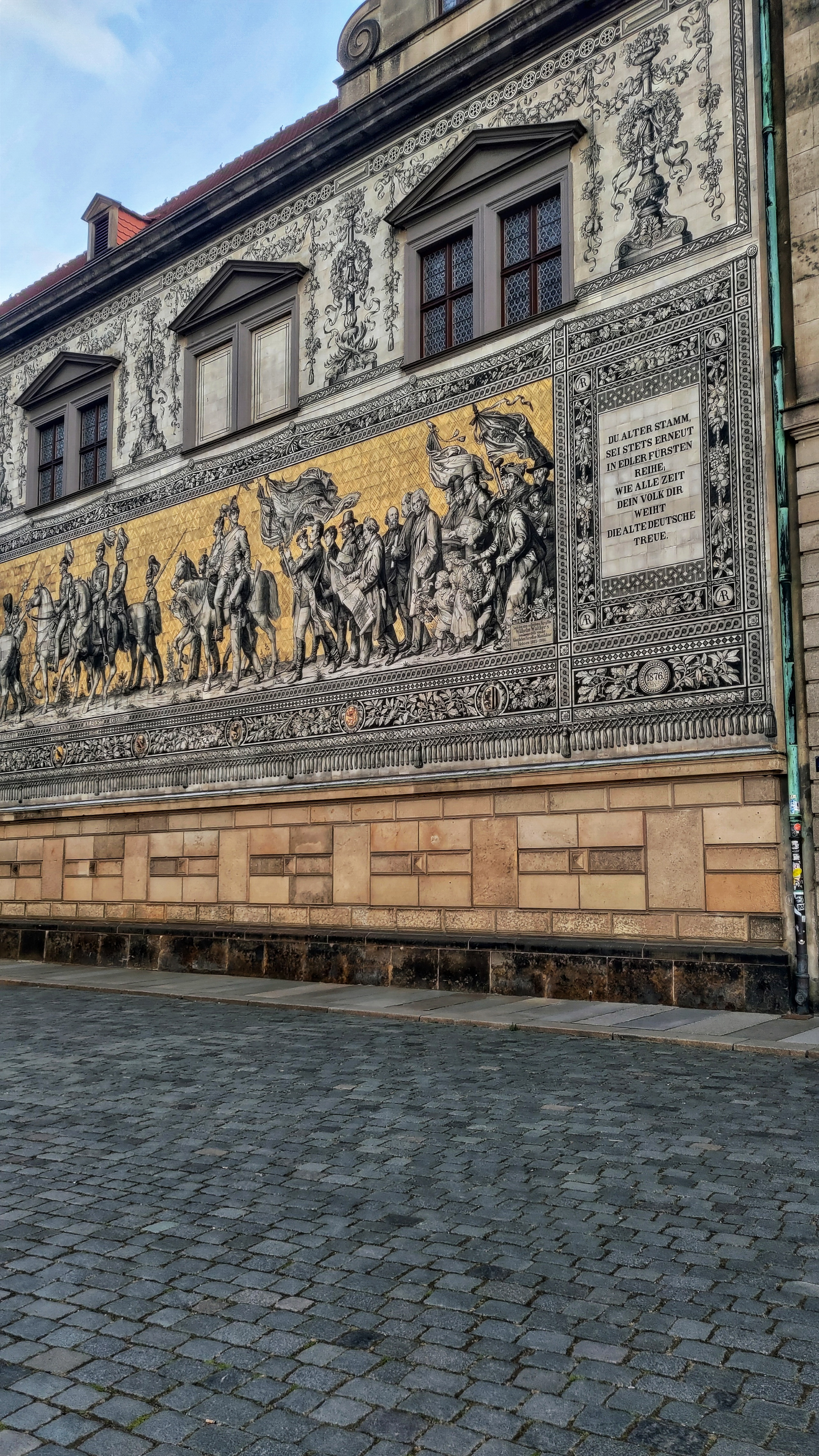 Sensazionale! 😍 Sulla facciata del Palazzo Reale si trova questo enorme murale formato da quasi 25.000 mattonelle di porcellana, lungo 100 metri e alto addirittura 10: un’opera d’arte unica al mondo! Il Fürstenzug, completato a inizio ‘900, è stato l’unico monumento di Dresda a superare quasi indenne tutti i bombardamenti.