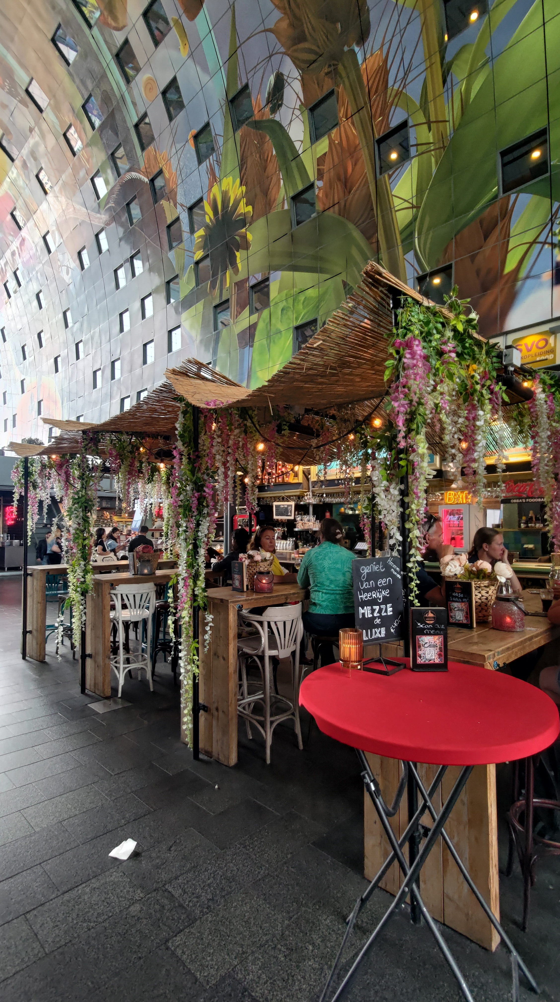 - Perché è un’incredibile opera d’arte. Ebbene sì, vi basterà alzare lo sguardo per ammirare il gigantesco e coloratissimo murales che omaggia il cibo in tutte le sue forme. 🖼️ La “Cornucopia” copre una superficie di ben 11.000m² ed è composta da grandi pannelli di alluminio. Anche l’architettura del Markthal è stupefacente con un’altezza di 40 metri e una struttura ad arco che fa ampio uso di vetrate, davvero un’ottima scelta!